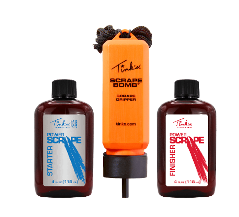 Tink’s® Power Scrape® All-Season Kit helps pattern bucks with Starter and Finisher scents and a Scrape Bomb® dripper that releases scent during daylight hours. Ideal for natural or mock scrapes, this kit encourages repeat visits all season long. Includes two 4 oz. bottles and one scent dripper.